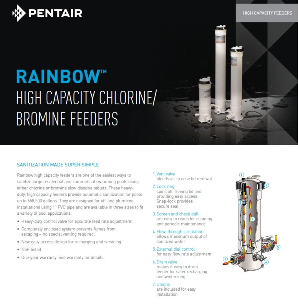 Rainbow HC-3315 high capacity feeders are one of the easiest ways to sanitize large residential and commercial swimming pools using chlorine to slow dissolve tablets. They are designed for off-line plumbing installations using 1″ PVC pipe and are available in three sizes to fit a variety of pool applications.