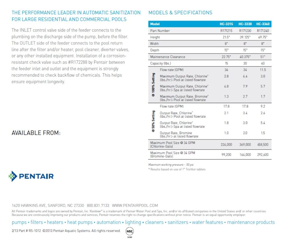 PENTAIR COMMERCIAL CHLORINATOR FEEDER HC3315