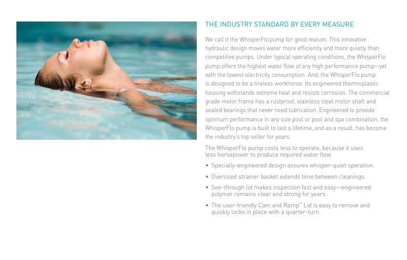 This pump’s hydraulic design offers the high water flow while providing quiet performance. The WhisperFlo High Performance Pump is built to last, with an engineered thermoplastic housing and robust motor components. Unique design features make this pump easy to monitor and clean.